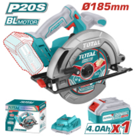 Акумуляторна циркулярна пила TOTAL TSLI18511 з напругою акумулятора 20В призначена для поздовжнього та поперечнього розпилювання матеріалів з деревини, пластику, алюмінію. Безщітковий двигун гарантує високу потужність і тривалий час роботи. Максимальна глибина різу при 45° - 45мм, при 90° - 65мм, кількість обертів - 4800 об/хв. Розмір пилкового диску - 185х20мм. До комплекту входять пилковий диск - 1шт., шестигранний ключ - 1шт., акумуляторна батарея 4 А, зарядний пристрій, коробка.