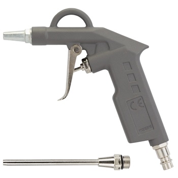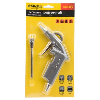 Пістолет продувний пневматичний (металевий корпус) 26/122мм SIGMA (6831051) використовується для продувки або очищення різних поверхонь. Надійний корпус, виконаний з алюмінієвого лиття під тиском, захищає внутрішні механізми від ударів і інших пошкоджень механічного типу. Легкий корпус пістолета забезпечує комфортну роботу.