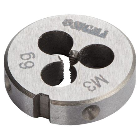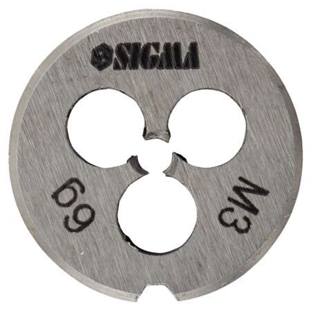 Плашка М3×0.5мм SIGMA (1604081) призначена для нарізування або калібрування зовнішніх різьб. Для роботи закріплюються в тримачах для плашок зі стопорними гвинтами. Для фіксації на зовнішньому циліндрі плашки існують конічні поглиблення і кутовий паз. При нарізанні, різьблення, попередньо, змащують консистентним мастилом.
