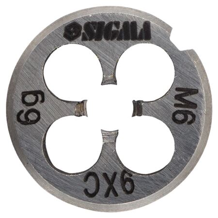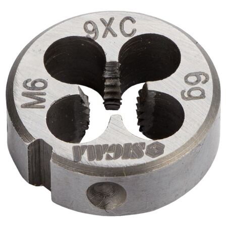 Плашка М6×1.0мм SIGMA (1604171) призначена для нарізування або калібрування зовнішніх різьб. Для роботи закріплюються в тримачах для плашок зі стопорними гвинтами. Для фіксації на зовнішньому циліндрі плашки існують конічні поглиблення і кутовий паз. При нарізанні, різьблення, попередньо, змащують консистентним мастилом.