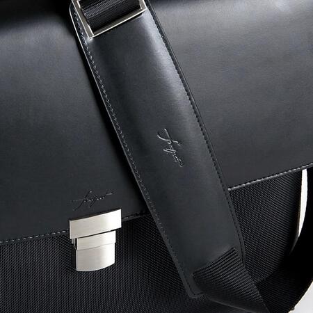 Класичний бізнес-дизайну. Сучасні кольори та матеріали. Ручка та оздоблення з високоякісної шкіри. Основний матеріал – ультраміцний нейлон 1680 Den. Логотип на нейлон всередині сумки. Практичні та великі фронтальні відділення. Відділення для авторучок, бізнес-карток, дискет тощо. Регульований знімний плечовий ремінь. Ремінь для кріплення на ручці багажної сумки-візка. Спеціальне захищене відділення для ноутбука.