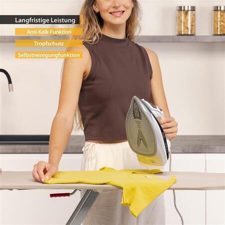 Праску можна використовувати як зазвичай на прасувальній дошці або вертикально для розвішування одягу за допомогою парового удару. Завдяки практичному замикаючому механізму базової станції праскою також можна керувати за допомогою кабелю. Керамічна підошва з антипригарним покриттям дозволяє прасці ковзати по всьому текстилю, не прилипаючи. Праска також самоочищається, має функцію захисту від крапель і накипу.