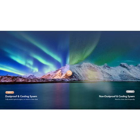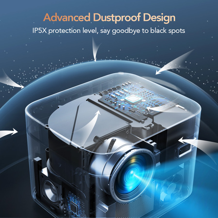 Yaber U11 гарантує бездоганне зображення та інноваційні пилозахисні технології. Навіть якщо проєктор часто переміщається або використовується на відкритому повітрі, спеціальна система захищає його від проникнення пилу та зберігає чистоту оптики для стабільної роботи вентиляції. Результат — завжди яскраві кольори, чіткість зображення та ефективне охолодження, яке працює бездоганно, навіть після декількох років активного користування проєктором. Пил не стане на заваді вашому перегляду — тільки бездоганна якість картинки!