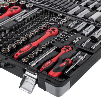 Ключовою особливістю набору стали ударні головки із Cr-Mo сталі, найпопулярніших розмірів для обслуговування автомобіля (17, 19, 21 мм). Вони легко витримують великі навантаження без деформації і готові впоратися навіть з найскладнішими завданнями. Розмаїття інших торцевих головок дозволяє виконувати переважну більшість завдань під час ремонту автомобіля. Насічки в місці хвату (по центру головки) запобігають прослизанню в руках.