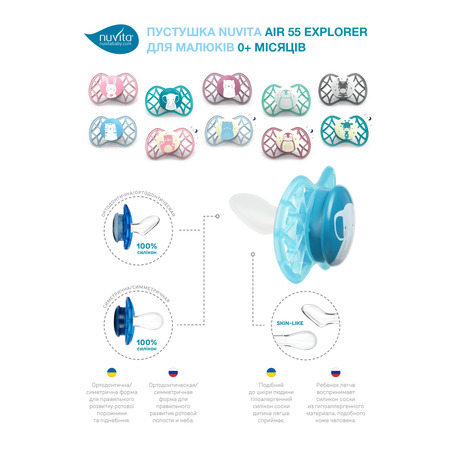 Пустушка симетрична Nuvita NV7067 Air55 Explorer 0m+ у комплекті з заєць і ведмедик NV7067F - це набір двох симетричних пустушок з чудовим дизайном заєць і ведмедик. Ці пустушки призначені для дітей від народження і виготовлені з м'якого та безпечного для здоров'я матеріалу. Вони допомагають розвивати правильну роботу ротової порожнини та можуть бути комфортним аксесуаром для немовлят під час спання або годування. Яскравий дизайн та милі образи зайчика і ведмедика зроблять ці пустушки привабливими для дітей. Цей набір пустушок може бути чудовим подарунком для батьків новонароджених дітей.