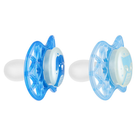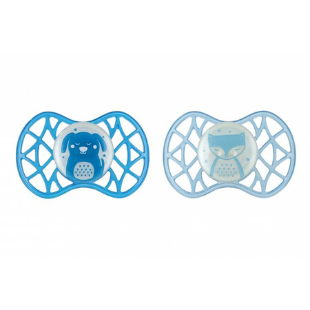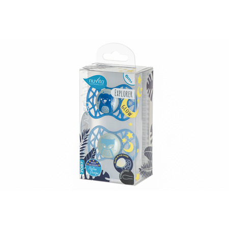 У наборі пустушок симетричних Nuvita NV7087 Air55 Explorer 6m+2шт. (собачка, лисичка) (NV7087GM) пустушки мають функцію світіння в темряві. Ці пустушки призначені для дітей від 6 місяців і мають яскравий і цікавий дизайн із зображенням собачки та лисиці. Вони допомагають у розвитку правильного смоктання і роботи ротової порожнини у дітей. Пустушки виготовлені з безпечного матеріалу і можуть бути зручним та комфортним аксесуаром для заспокоєння дітей. Функція світіння дозволяє легше знаходити пустушку в темряві. Цей набір може бути корисним для батьків та приємним для дітей, надаючи їм комфорт і безпеку.