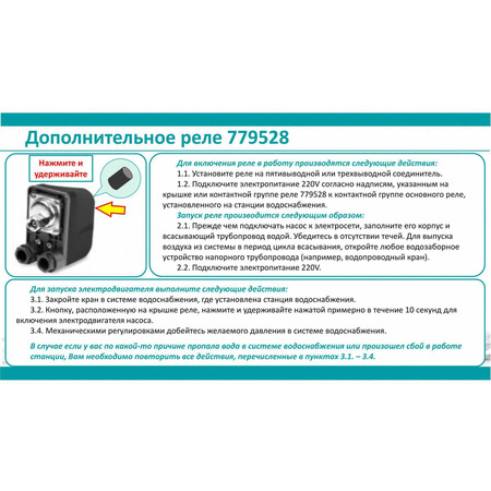 - Реле тиску може працювати тільки спільно з гідроакумулятором.