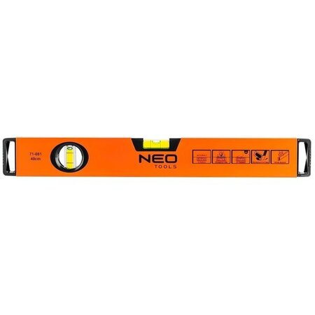 Рівень Neo Tools алюмінієвий, 40 см, з 2 капсулами та фрезерованою поверхнею - це компактний інструмент для вимірювання горизонталі та вертикалі. Виготовлений з високоякісного алюмінію, він дуже легкий і міцний. Рівень оснащений двома капсулами для точного визначення рівня, а фрезерована поверхня забезпечує оптимальний контакт з робочою поверхнею для більш точних вимірювань. Цей рівень ідеально підходить для робіт вдома, в гаражі чи на будівельному майданчику, де потрібно точно встановити горизонтальні або вертикальні лінії. Рівень Neo Tools алюмінієвий, 40 см, є надійним інструментом, який допоможе вам досягти точних результатів у вашій роботі.