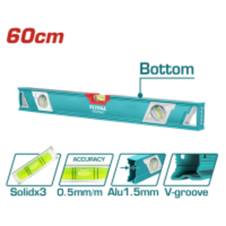 Рівень алюмінієвий TOTAL TMT26086 застосовується в будівельних та оздоблювальних роботах для визначення рівності поверхні. Рівень виготовлений з алюмінієвого профілю з трьома вічками. Товщина профілю - 1.5 мм, довжина рівня - 600 мм, точність - 0.5 мм/м.