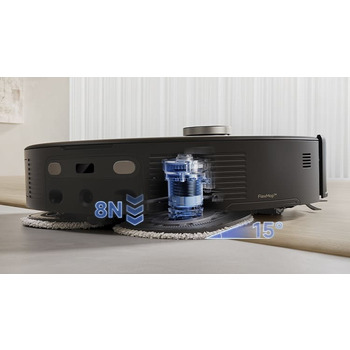 Нова технологія FlexMop RoboSwing дозволяє швабру подовжуватися для прибирання безладу вздовж країв та нерівних кутів. У складних місцях робот-пилосос повертає корпус з шваброю, що подовжується, досягаючи відстані до 4 см, щоб дістатися до важкодоступних кутів і прихованих областей, забезпечуючи більш ретельне прибирання навіть під низькими диванами.