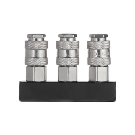 Прямий розгалужувач повітря дозволяє одночасно під'єднати 3-х користувачів повітря і побудувати потужну пневматичну систему з тиском до 10 бар. На вході повітря встановлена різьба 1/4", а на виходах - надійні універсальні швидкороз'ємні з'єднання, які дозволяють легко підключити шланги високого тиску з пневмоінструментом.