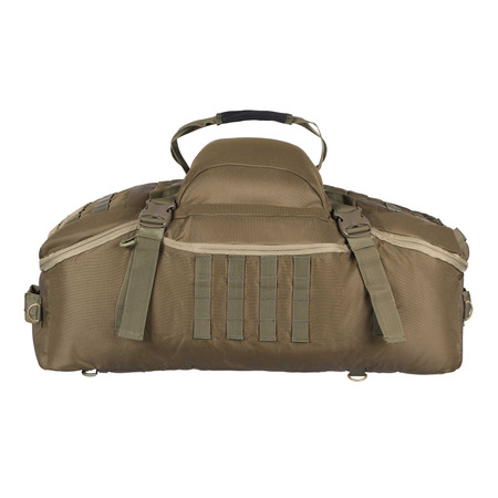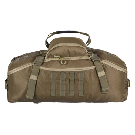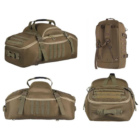 Изделие зеленого цвета изготовлено из устойчивых к износу материалов (полиэстер и нейлон), поэтому будет служить оно надежно и в течение длительного времени. Сумка-баул достаточно вместительна, ее полезный объем составляет 70 л – уместится самое необходимое снаряжение, одежда, вещи и т.д. К тому же, кроме основного отделения, есть еще и боковые дополнительные карманы для хранения разнообразных безделушек. Едва ли не главной особенностью модели является возможность переноса тремя разными способами, в частности: конструкцией предусмотрена усиленная рукоятка для ношения в руках, съемный плечевой ремень со смягчающей сетчатой накладкой, а также в скрытом кармане хранятся съемные плечевые ремешки для использования изделия в качестве рюкзака.