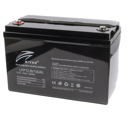 Акумуляторна батарея Ritar LFP12.8V100AH є літій-залізо-фосфатним типом акумулятора з великою ємністю 100 Ампер-годин і вихідною напругою 12,8 Вольт. Цей акумулятор має максимальний струм заряду та розряду 100 Ампер, а також вбудований захист від перезаряду, перерозряду, перегріву і короткого замикання, що забезпечує безпеку під час використання.