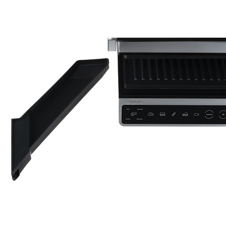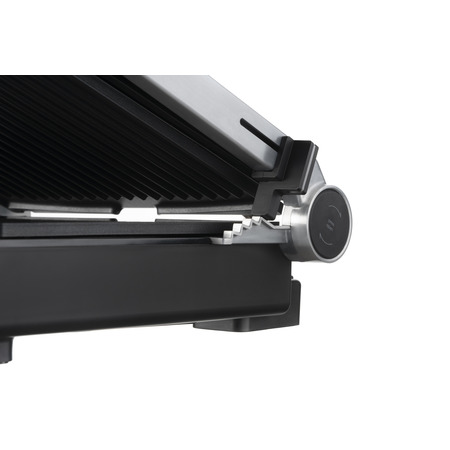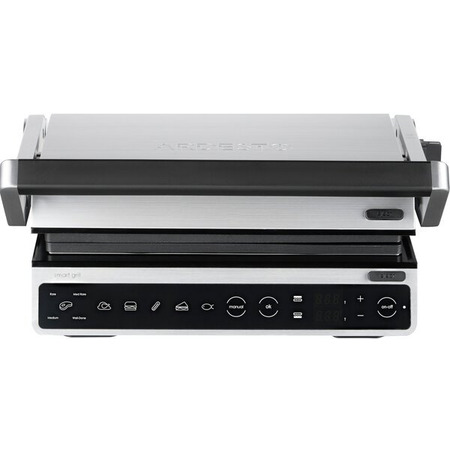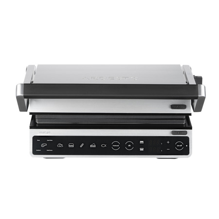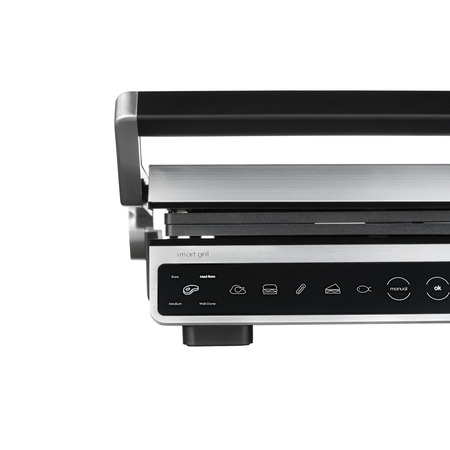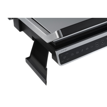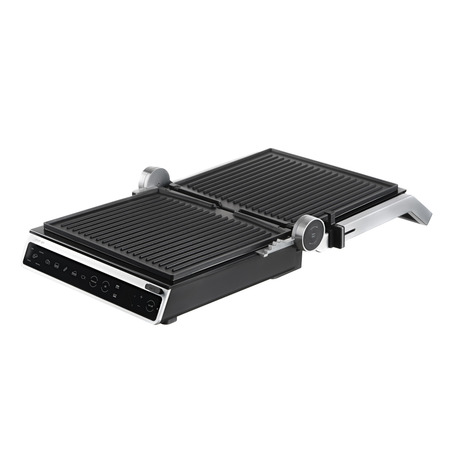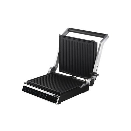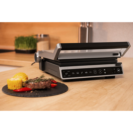 Электрогриль мощностью 2000 Вт, с сенсорным управлением, шестью автоматическими режимами приготовления, регулировкой температуры, степенью прожарки и готовности, а также автоматическим определением толщины продукта. Полное раскрытие пластин конструкции позволяет использовать обе поверхности для одновременного приготовления продуктов, с возможностью отдельной установки температуры для каждой пластины. Съемные пластины с антипригарным покрытием и лоток для сбора жира и других отходов обеспечивают удобную и простую очистку и мытье устройства.