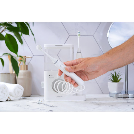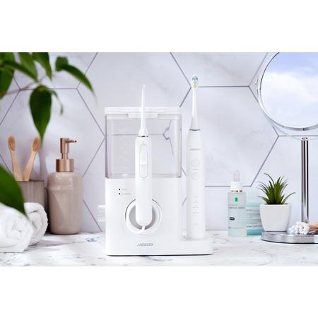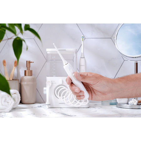 Стационарный ирригатор с функциями чистки и массажа десен. Имеет 10 режимов давления воды в диапазоне 0,2-0,86 МПа. Частота пульсации ирригатора составляет 1400 раз в минуту, именно такой параметр рекомендован стоматологами. Класс водостойкости прибора: IPX4 — это обеспечивает надежную защиту от брызг и сплошного скропления влаги. Объем резервуара для воды — 600 мл, этого достаточно минимум для двух полноценных сеансов чистки. В комплекте к ирригатору есть две классические насадки, с помощью которых легко полностью очистить труднодоступные места полости рта, до которых не может добраться обычная зубная щетка. А также очиститель языка, позволяющий эффективно очистить поверхность языка от налета и вредных бактерий.