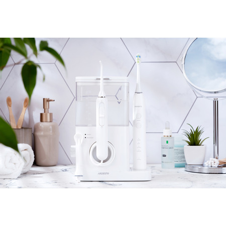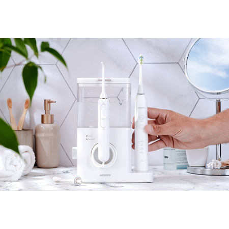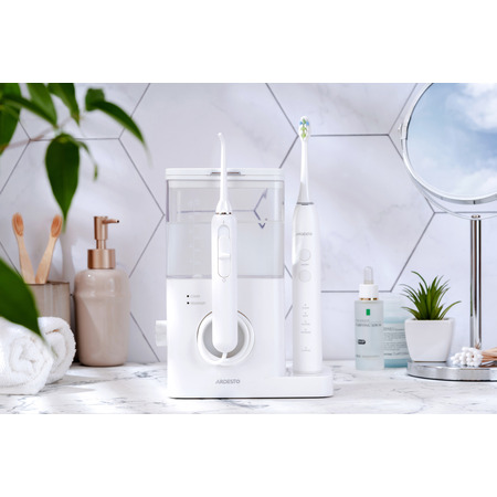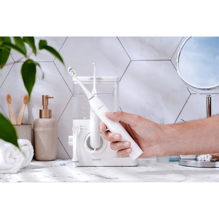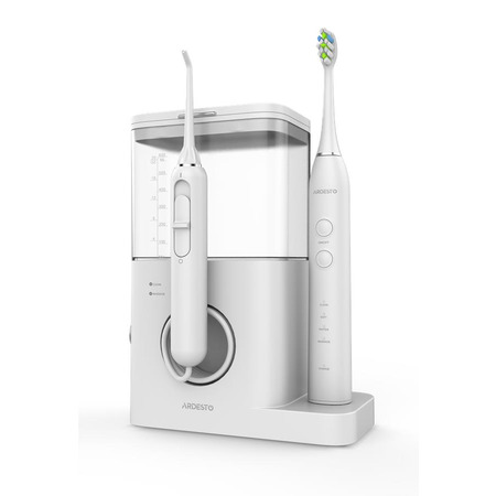 Электрическая зубная щетка со средней жесткостью щетины обеспечивает эффективную и безопасную очистку зубов. Современная звуковая технология чистки с частотой пульсации — 40000 движений в минуту. Есть четыре режима для различных потребностей: стандартная чистка, чувствительные зубы, отбеливание и массаж десен. В комплекте две классические насадки. Класс защиты IPX7 — защищен от попадания влаги даже во время длительного погружения в воду. Питание щетки происходит благодаря встроенному аккумулятору Li-Ion с емкостью 650 мАч, чего хватит до 25 дней работы на одном заряде. Щетка заряжается беспроводным путем с помощью индукционной док-станции, встроенной в корпус основного устройства. Комплект состоит из стационарного ирригатора и электрической зубной щетки со звуковой технологией чистки и средней жесткостью щетины DuPont. Благодаря этому комплекту можно качественно и эффективно чистить зубы, удалять зубной налет и камень и предотвращать их образование, делать массаж десен и очищать поверхность языка, сохраняя свежесть дыхания.