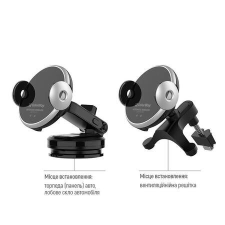 Два комплекта крепления: 1. Специальная силиконовая присоска надежно фиксирует держатель не только на лобовом стекле, но и на практически любой приборной панели. 2. Регулируемый зажимной механизм с прорезиненными вставками со специальными упорами, подходит для решеток дефлектора различной толщины и конструкции