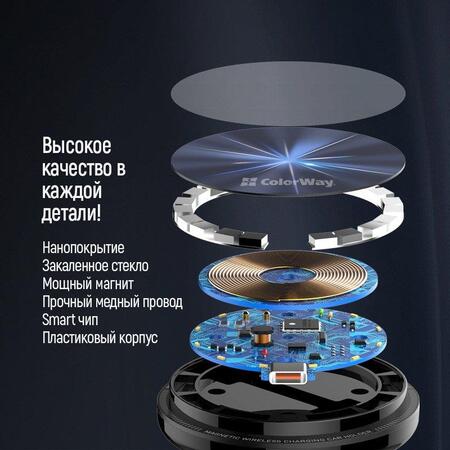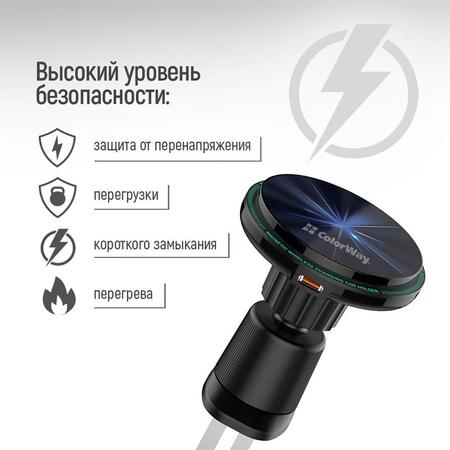 Магнитный автодержатель ColorWay со встроенной беспроводной зарядкой мощностью 15 Вт обеспечивает быструю и эффективную зарядку вашего смартфона с помощью технологий Qi и Qi Fast Charge. Благодаря поддержке Apple MagSafe*, держатель позволяет точно разместить телефон для максимальной скорости подзарядки. Мощные магниты надежно удерживают телефон даже на неровных дорогах. Обновленная крепежная конструкция гарантирует стабильность и совместимость с различными типами дефлекторных решеток. Поворотный шарнир на 360° позволяет настроить идеальный угол наклона для вашего удобства.