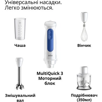 блендер, венчик для взбивания, измельчитель 350мл, мерный стакан 600мл, инструкция