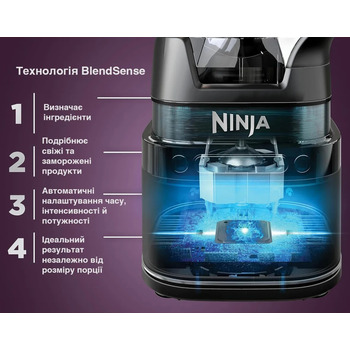 моторная база 1700PW с технологией BlendSense, чаша 1,9 л, 2 чашипо 600 мл, крышка кувшина с дозатором Ninja Detect Total, ножи для измельчения и нарезки (набор ножей в комплекте), руководство с 5 рецептами для вашего вдохновения