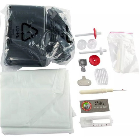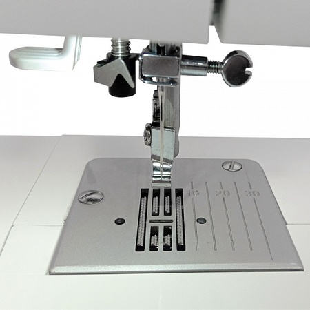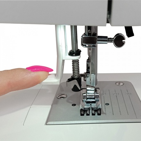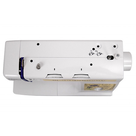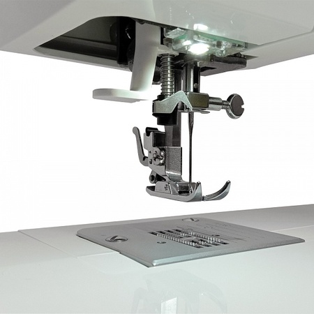 Эта модель прекрасно шьет шелк, драп, трикотаж, джинсу сложенную в несколько сложений. Максимальный подъем кавычки – 14 мм. При наматывании нити на катушку срабатывает автоблокировка игловодца. Можно производить строки двойной иглой. В комплектацию входит второй катушечный стержень. Двойная игла приобретается дополнительно. Выполнить штопку или закрепление можно с помощью клавиши реверсии. Для работы с мелкими изделиями снимите съемный столик и шейте на свободном рукаве.