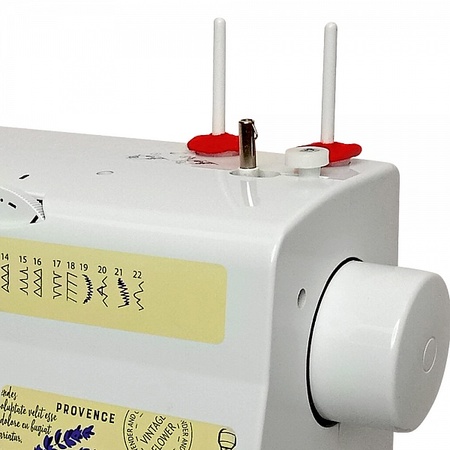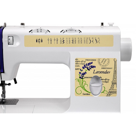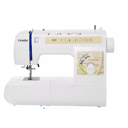 Leader Lavender – электромеханическая швейная машина с классическим вертикальным челноком и встроенным нитевдевателем. 22 необходимые швейные операции: прямая строчка, трикотажные строчки, зигзаг, эластичный зигзаг, пунктирный зигзаг (для пришивания резинки), строчка для квил и декоративные строчки, петля для пуговиц выполняется в полуавтоматическом режиме.