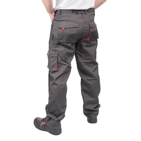 Робочі брюки темно-сірого кольору виготовлені з міцної тканини: 80% поліестер і 20% бавовна зі щільністю 260 г/м². Наявність великої кількості кишень дозволяє розвантажити руки і забезпечує швидкий доступ до підручного інструменту.