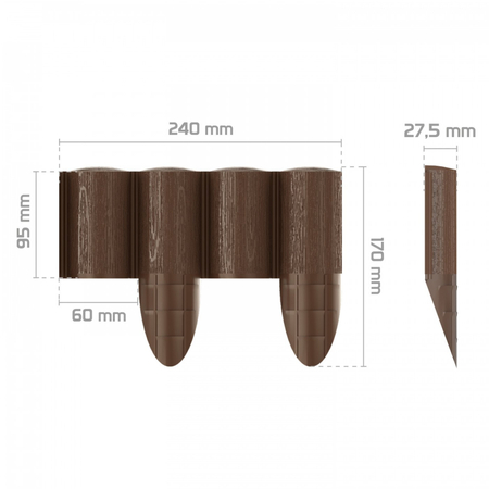 Палисад огородный 4 ECO идеально отделяет газон или тропинку от возделываемой части огорода или цветочных грядок. Новаторское решение конструкции булавки предупреждает ее разрушение во время вбивания. Текстура поверхности - „под дерево” не требует технического обслуживания. Устойчива к ультрафиолетовому излучению - стойкий цвет, морозостойкая. Удобный способ соединения элементов позволяет формировать ограждение палисада произвольным образом.