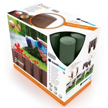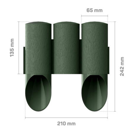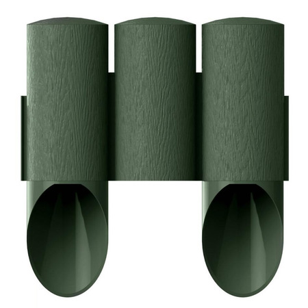 Идеально отделяет газон или тропинку от огорода или цветочных клумб. Конструкция нижней части предупреждает ее разрушение во время вбивания в землю. Текстура поверхности - „под дерево”. Не требует технического обслуживания. Устойчива к ультрафиолетовому излучению - стойкий цвет, морозостойкая. Удобный способ соединения элементов позволяет формировать ограждение произвольным образом. Цвета: коричневый, зеленый, терракот. Длина комплекта 2,1 метр.