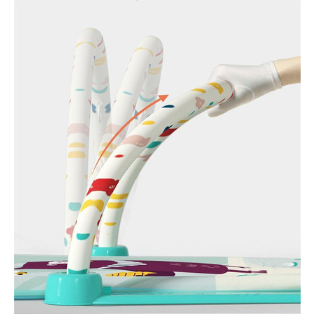 Озвучка и песни на китайском языке. Выполнен из синтетического гипоаллергенного материала. 4 погремушки и ночник-луна крепятся к дуге. Ребенок будет тянуться в верх и стараться сесть. Пианино издает мелодии и светиться при нажатии на клавиши, также его мо