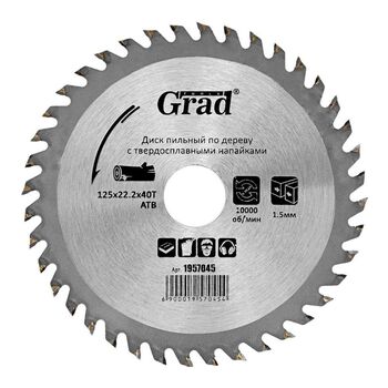 Диск пиляльний по дереву з твердосплавними напайками Ø125×22.2×40Т, 10000об/хв GRAD (1957045) призначений для виконання будь-яких стандартних робіт по дереву, різання виробів з м'якої і твердої деревини, фанери, ДСП, ДВП, МДФ і комбінованих матеріалів на основі дерева. Додатковою перевагою є можливість заміни і заточування зуба.