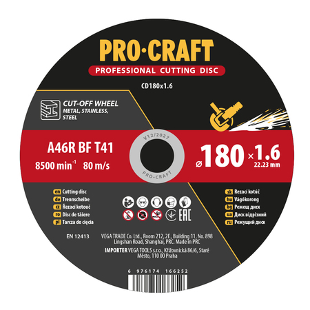 Диск відрізний Procraft CD180x1.6 має наступні характеристики: - Діаметр: 180 мм - Товщина: 1,6 мм - Діаметр отвору: 22,2 мм
