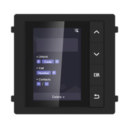 DS-KD-DIS — розширювальний модуль з монітором, призначений для використання з панеллю виклику Hikvision. Істотно розширює стандартний функціонал. Сумісний з DS-KD8003-IME1. Накладний або термінал чорного кольору, що врізається, оснащений дисплеєм, а також чотирма фізичними кнопками. Використовуючи DS-KD-DIS, можна набрати номер конкретної квартири або офісу або увійти самостійно, активувавши правильний PIN-код. Є підсвічування, окремий порт для налагодження та інтерфейс для з'єднання з основним пристроєм. Розширювач важить близько 400 грам і має захист IP65, що дозволяє встановлювати його на вулиці. Передвстановлено операційну систему, є внутрішня пам'ять, у якій зберігаються контакти абонентів. Рідкокристалічний екран насичений та приємний.