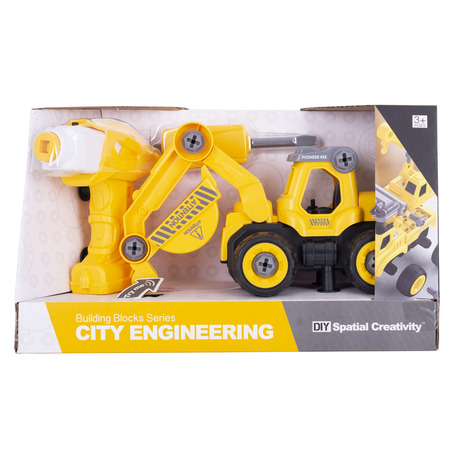 DIY конструктор - екскаватор складається з 28 деталей і знімного електродвигуна, який також використовується для роботи шуруповерта. У комплекті є хрестова і плоска викрутка. Люк кабіни відчиняється, а ківш у ескалатора рухливий. Їздить назад і вперед, після натискання кнопки на бампері видає звуки сигналізації. Живлення: двигун - 2 АА (немає в комплекті), сигналізація - 3AG13 (у комплекті). У коробці 33х14х19. Підходить для дітей віком від 3-х років.