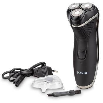 Электробритва MG-686 для влажного и сухого бритья с тремя подвижными бритвенными головками обеспечит идеальный результат за счет плотного прилегания вращающихся лезвий к коже. Эта модель роторной бритвы с качественными двойными лезвиями и системой повторения контуров лица деликатно относится к коже. Аккумулятора после 8-ми часовой зарядки хватает на 45 минут автономной работы. Ухаживать за бритвой проще простого, достаточно просто промыть ее режущий блок под проточной водой не более 5-ти секунд. Три плавающих головки, триммер для подравнивания висков, эргономичная рукоятка делают использование прибора комфортным и безопасным.