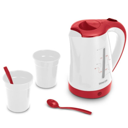 Електрочайник Sencor SWK150RD є зручним і компактним рішенням для тих, кому необхідно швидко закип'ятити невелику кількість води. З ємністю 0,5 літра він ідеально підходить для персонального використання, наприклад для ранкової кави або чаю. У комплекті йдуть дві чашки та дві ложки, що робить його чудовим вибором для подорожей або для використання на роботі.