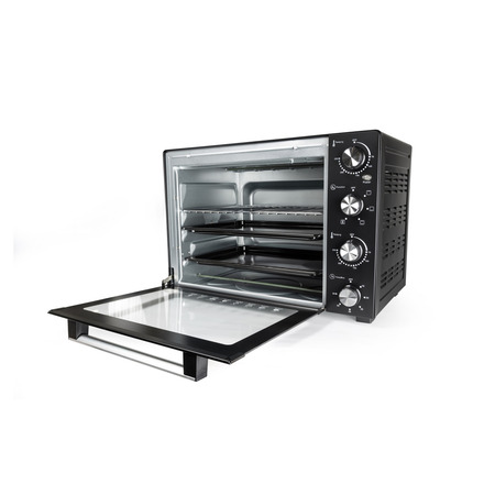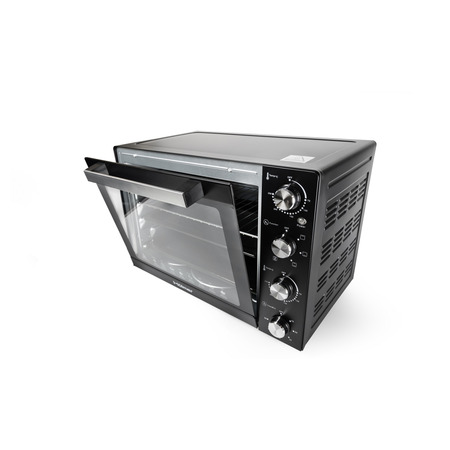 На лицевой панели электропечи расположен механический регулятор температуры. Термостат позволяет устанавливать температуру от 100 до 250°С. Такая возможность настройки теплового режима позволяет готовить блюда как при сильном нагревании (при 250°С), так и при легком термическом воздействии. Блюда не пригорают даже при высокой температуре, потому что горячий воздух внутри печи распределяется равномерно.