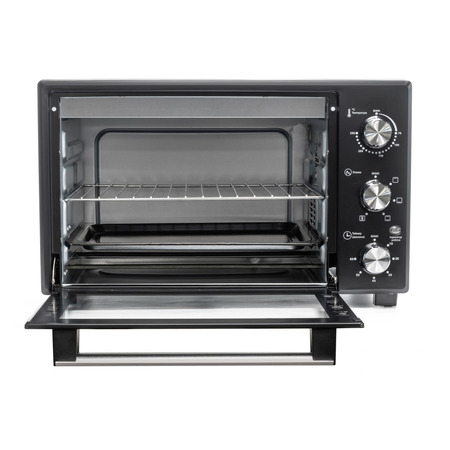 На лицевой панели электропечи расположен механический регулятор температуры. Термостат позволяет устанавливать температуру от 70 до 250°С. Горячий воздух внутри печи распределяется равномерно, не давая пригореть блюду, даже при высокой температуре. Функция настройки теплового режима позволяет качественно обрабатывать продукты как при сильном нагревании (при 250°С), так и при легком термическом воздействии.