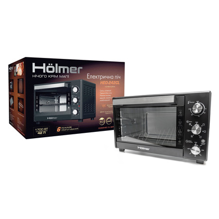 Электрическая печь Holmer HEO-242CL проста в уходе и эксплуатации, устанавливается на любую ровную поверхность. Работает от сети 220 В, длины шнура в 1 м достаточно для удобного размещения на кухне и комфортной работы.