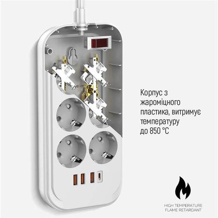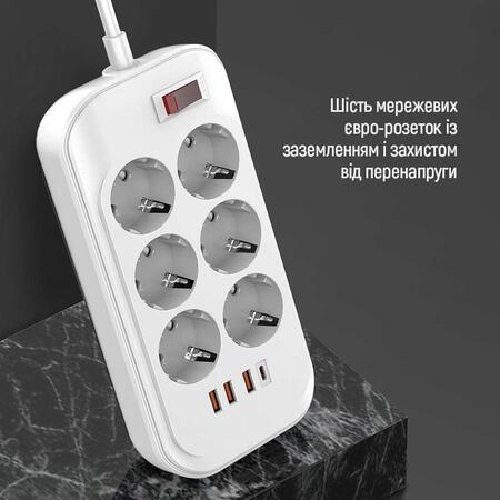 Удлинитель с шестью сетевыми розетками 220В и четырьмя USB-портами. Защитные шторки Child Security Door обеспечивают безопасность, а автоматическая балансировка нагрузки распределяет мощность между USB-портами (до 36W). Три USB-порта поддерживают быструю зарядку Quick Charge 3.0, а четвертый порт USB-C PD – PD с поддержкой Apple – fast charging. Удобная кнопка включения/выключения и светодиодная индикация сделают пользование еще более удобным. Этот удлинитель позволяет не только подключать электроприборы, но и одновременно заряжать до четырех мобильных устройств, таких как смартфоны, планшеты, внешние батареи и т.п., поддерживающие зарядку через порт USB. Контактные группы розеток изготовлены из высококачественного медного сплава, а корпус из огнеупорного пластика, устойчивого к температурам до 850°C. Удлинитель также имеет заземление и защиту от перенапряжения, что делает безопасным.