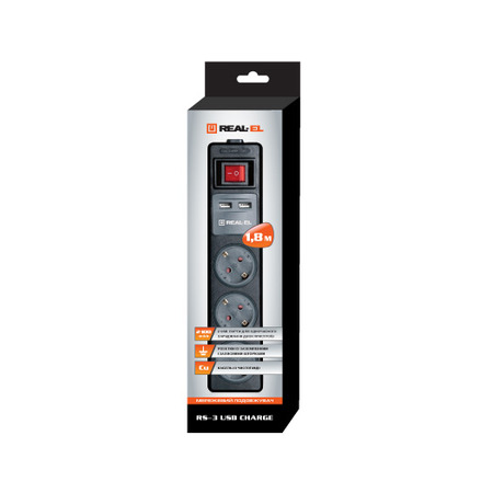 Сетевой удлинитель REAL-EL RS-3 USB Charge со встроенным USB зарядным устройством предназначен для подключения к электрической сети электроприборов и одновременной зарядки двух устройств. Имеет 3 розетки с заземлением и защитными шторками и 2 USB-порты для зарядки.