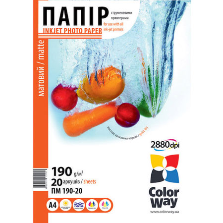 Матовая бумага ColorWay для струйной печати. Имеет высокую степень белизны и матовую ровную поверхность, обеспечивает высокий контраст, отсутствие бликов, отпечатков пальцев на нанесенном изображении. Обладает широкой цветовой гаммой и хорошим впитыванием чернил. Подходит для водорастворимых и пигментных чернил. Чем меньше у бумаги показатель плотности, тем меньше должна быть заливка листа. Хранить в сухом месте в стороне от солнечного света. Температура хранения от 5°С до 25°С. Не содержит вредных для здоровья веществ. Отпечатанные снимки рекомендовано хранить в альбомах или в рамках под стеклом. Эта модель бумаги предназначена только для печати на струйном принтере и персонального использования.