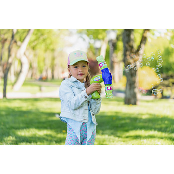 Із цим набором можна влаштувати справжню вечірку для невгамовних малюків. Користуватися просто: треба зняти суцільну кришку з пляшечки з розчином, замінити її на кришечку з отвором і встановити на генераторі. Увімкнути, натиснувши спеціальну кнопку, і бульбашки заполонять усе навколо! Працює від чотирьох батарейок АА (потрібно придбати окремо).