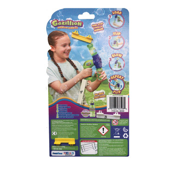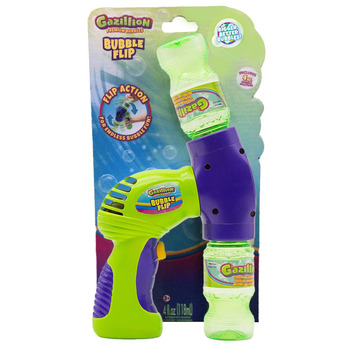 Представляем Gazillion Bubbles® Bubble Flip для непрерывного потока пузырьков! Благодаря дизайну флип-экшн веселье пузырей никогда не заканчивается! Вставьте бутылку с раствором в пузырчатый бластер, после полного нажатия на спусковой крючок начнется выдувание потока пузырьков. Когда бутылка опустеет, переверните переднюю часть бластера, используйте бутылку как ручку и снова нажмите на спусковой крючок, чтобы усилить действие пузырей! Каждый Bubble Flip имеет объём 118 мл. Подходит для детей от 3 лет.