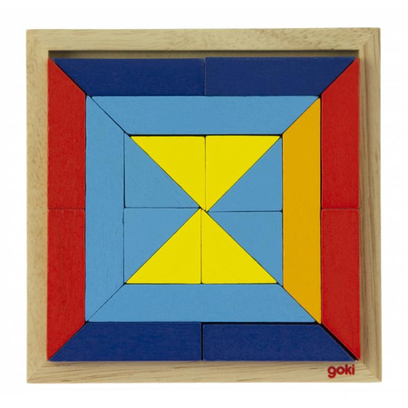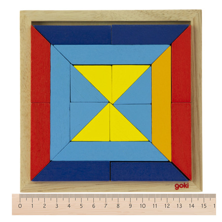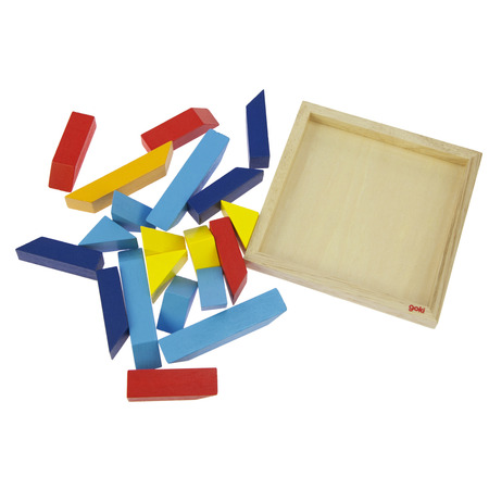 У наборі: - Дерев’яна рамка-основа натурального кольору - 20 великих і маленьких різнокольорових трикутників (червоні, жовті, зелені, блакитні, помаранчеві)