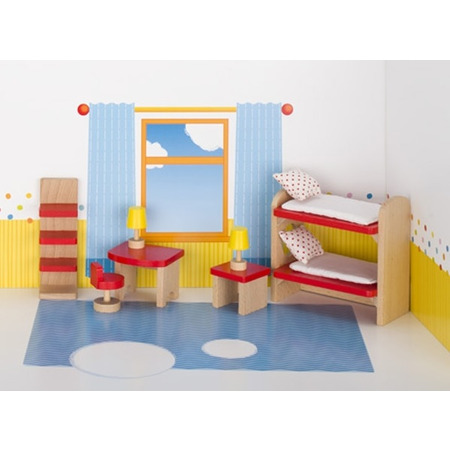 Деревянный набор мебели для кукольного домика подарит девушкам сказку, о которой они все так мечтают! Немецкий производитель игрушек goki предлагает набор «Мебель для детской комнаты» из дерева, все детали и элементы качественно обработаны. Цвет дерева натуральный и красный (покрыты безопасными красками на водной основе). Здесь есть: двухэтажная кроватка, полочка, два столика, стул, подушки, матрасики и лампы – все как настоящее. Хорошая мебель для детской позволит девочке стать настоящей хозяйкой в ??своем неповторимом мире детства. Игра будет развивать активность, навыки и навыки. Для детей от 3 лет.
