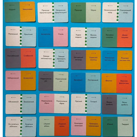 В комплекте с игрой есть все необходимое для увлекательного противостояния двух команд, в том числе это уникальный механизм для чтения мнений и более 120 двусторонних карт, а специальные маркеры помогут при подсчете очков. Участвовать в партии могут от 2 до 12 человек и даже больше, но даже минимальное количество игроков обещает не менее увлекательное противостояние.