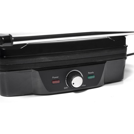 Электрогриль HCG-18P оснащен механическим регулятором температуры, расположенным на лицевой панели. Плавным поворотом регулятора можно задать желаемую температуру нагрева от 140 до 200°С. Угол открытия конструкции — 105°C/180°C, что очень удобно для использования. Разложив данное устройство горизонтально, у вас появится дополнительная площадь для приготовления вкусных шедевров.