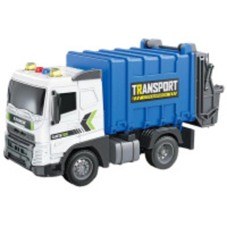 Сміттєвоз інерційний 1:20 має світлові та звукові ефекти, кузов відкривається, на кабіні є кнопки. Живлення: 3 батарейки типу AG13 (у комплекті). Розмір іграшки: 19х9х11 см. Упаковка: відкрита коробка.