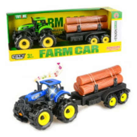 Інерційний трактор з причепом, який перевозить дерев'яні балки, має світлові та звукові ефекти, в асортименті 2 види (синій, зелений). Живлення: 3 батарейки типу AG13 (у комплекті). Розмір іграшки: 34х10х10.5 см. Упаковка відкрита коробка.